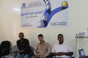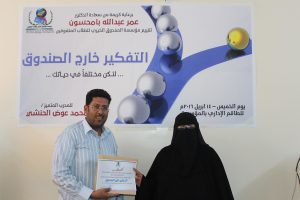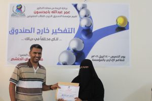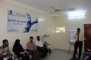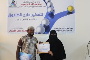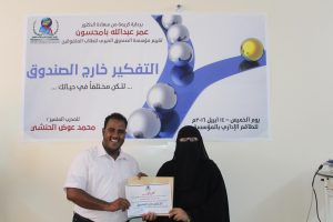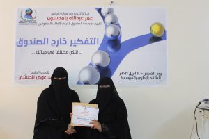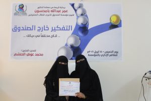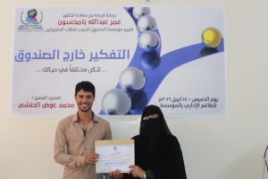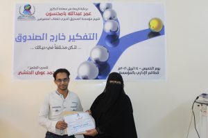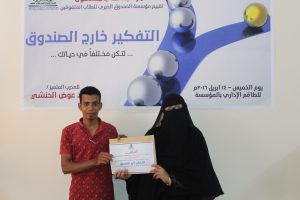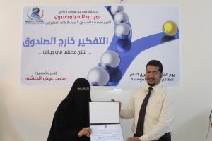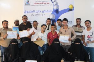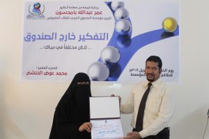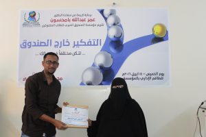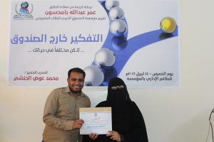 تحت هذا العنوان شهدت مؤسسة الصندوق الخيري للطلاب المتفوقين هذا اليوم الخميس 14 إبريل 2016 الدورة التدريبية النوعية (التفكير خارج الصندوق) التي درب بها المدرب/ محمد عوض الحنشي واستهدف فيها الطاقم الإداري للمؤسسة حيث جرى تنفيذها في مقر المؤسسة. افتتحت الدورة الأستاذة/ سولاف عبود الحنشي المدير التنفيذي للمؤسسة. وتأتي مثل هذه الدورات التدريبية ضمن الخطة السنوية التي تعدها المؤسسة وتنفذها ادارة البرامج والمشاريع بالمؤسسة والتي تهدف إلى تطوير وتأهيل موظفي المؤسسة والرقي بالعمل المؤسسي بالإضافة إلى إكتساب المهارات. كما تستهدف المؤسسة شركائها في عملية التدريب والتأهيل للكادر الوظيفي والعامل بالمؤسسات الشريكة.