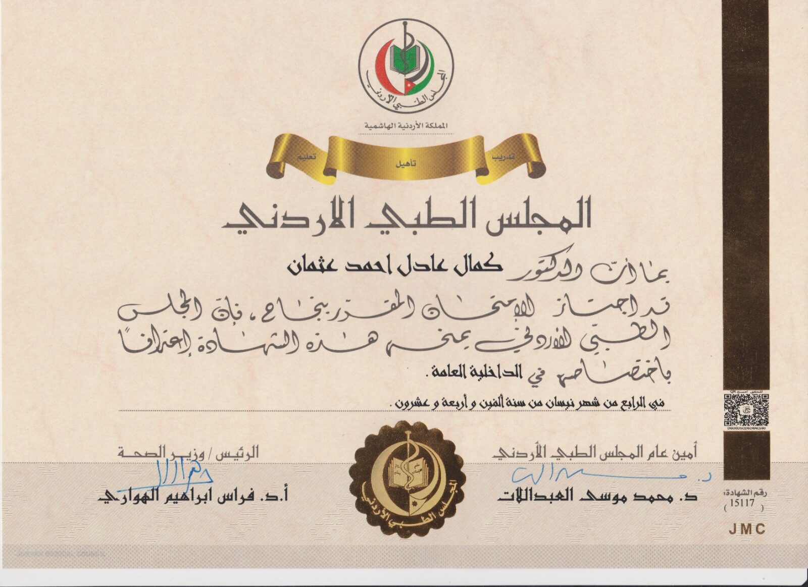 منح المجلس الطبي الأردني الدكتور كمال عادل احمد عثمان، الطالب المبتعث من قبل مؤسسة الأمل التنموية للطلاب المتفوقين بالعاصمة عدن، والصندوق الخيري للطلاب المتفوقين، شهادة البورد الطبي التطبيقي بتخصص الداخلية العامة “الباطنية العامة”، بعد أن أجتاز الامتحانات المقررة بهذا التخصص بنجاح، وعقب استكمال الدراسة التطبيقية لأربع سنوات (2020م/2024م).