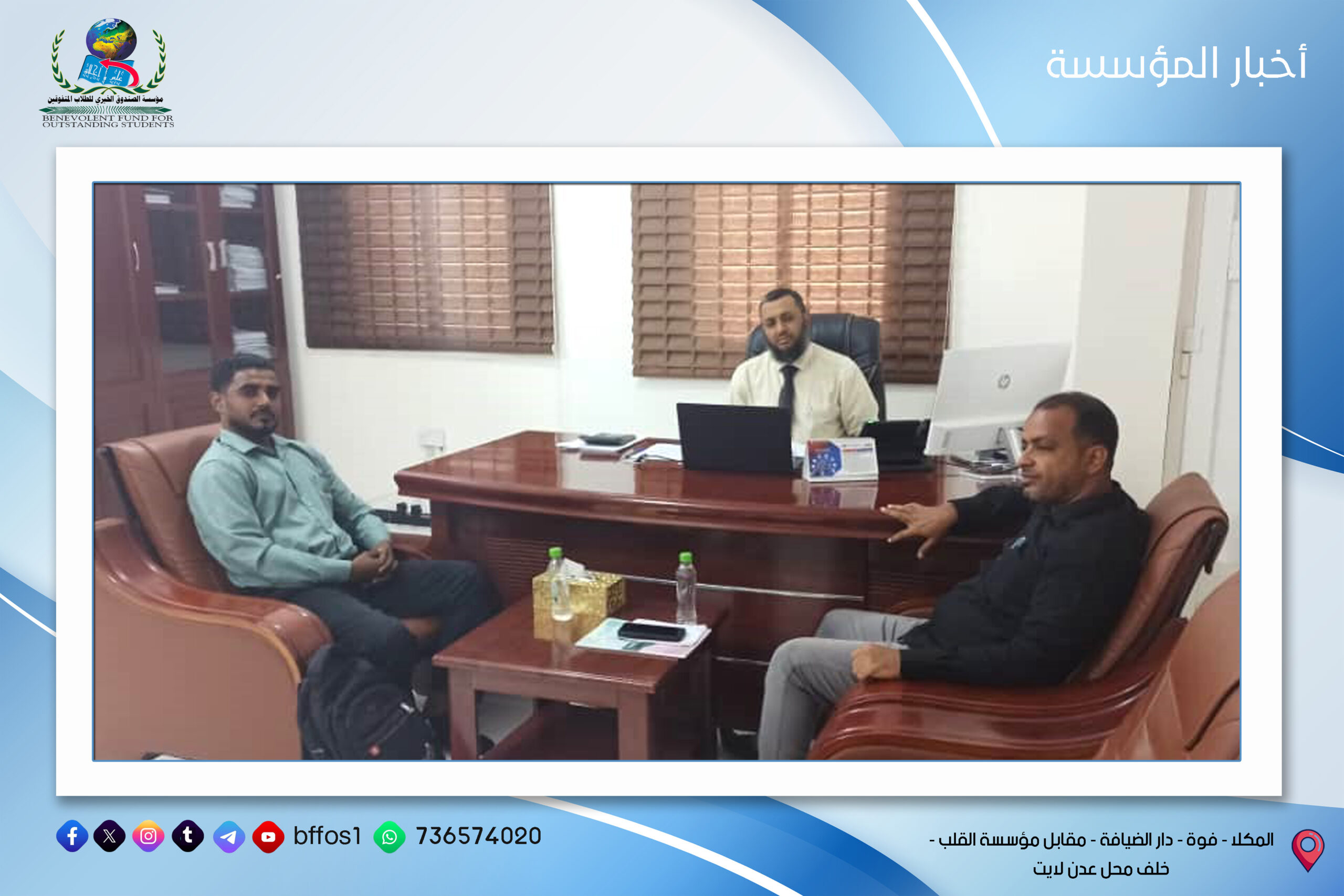 وفي اللقاء تم بحث أوجه التعاون بين المؤسسة والبنك سيما بعد الاستراتيجية العمل بالمؤسسة في الجانب المالي ، ومناقشة آلية صرف منح مستحقات الطلاب المتفوقين في الجامعات والمعاهد المنتسبين للمؤسسة في المنح الداخلية إضافة مرتبات موظفي المؤسسة .