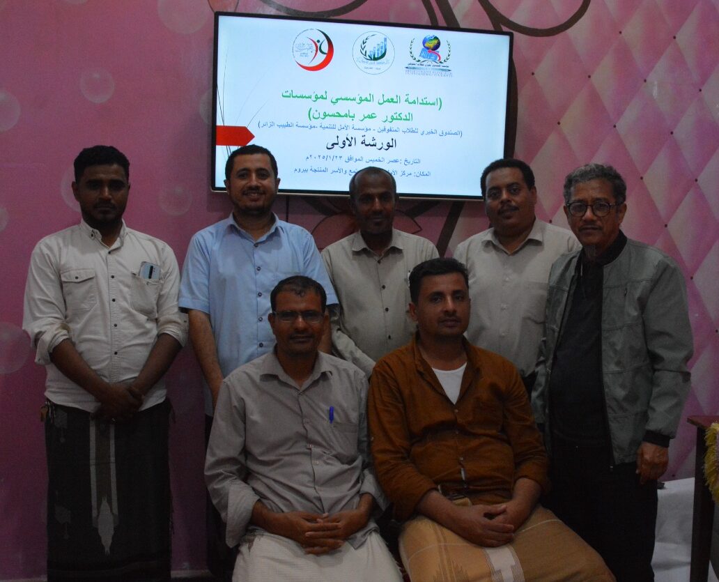 في اطار مشروع التطوير الاستراتيجي بالمؤسسات الشقيقة (مؤسسات سعادة د. بامحسون) تم إقامة ورشة عمل بعنوان الاستدامة بالعمل المؤسسي بإداره وتنظيم مؤسسة الأمل التنموية ببروم والتي شارك فيها أيضا مؤسسة الصندوق الخيري للطلاب المتفوقين و مؤسسة الطبيب الزائر عبر رؤساء مجالس الاداره والمدراء التنفيذيين والرقابه والتفتيش حيث جرى ترتيب الورشة على ثلاث جلسات: