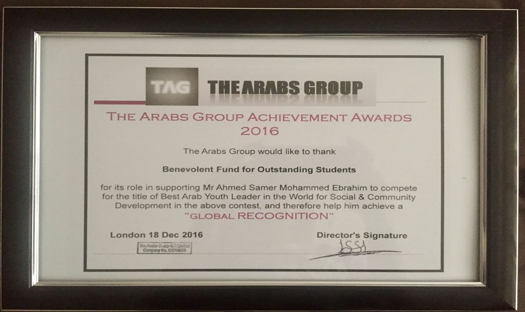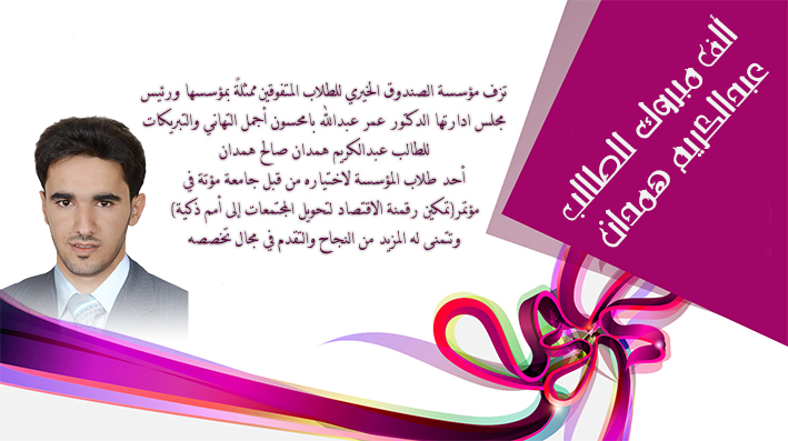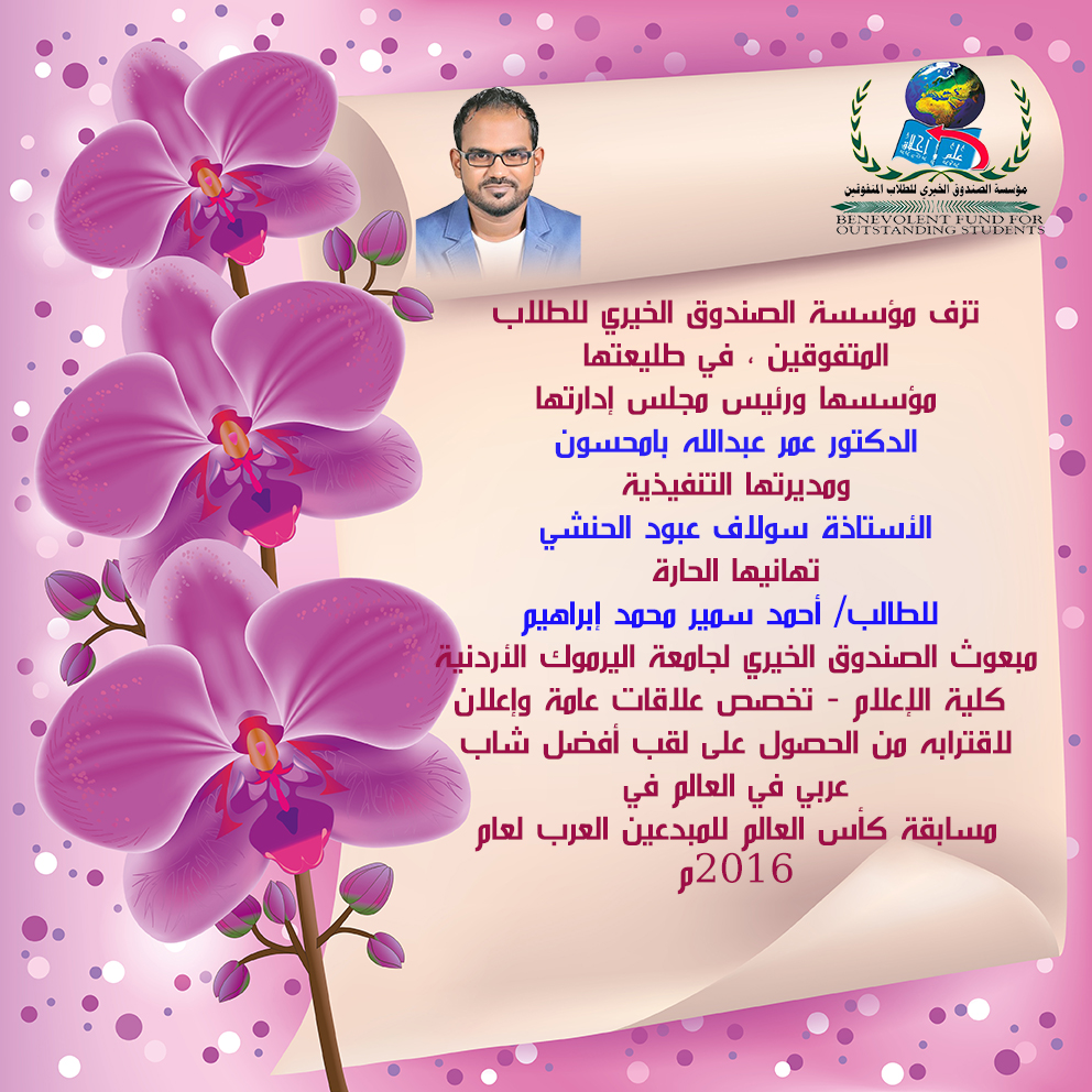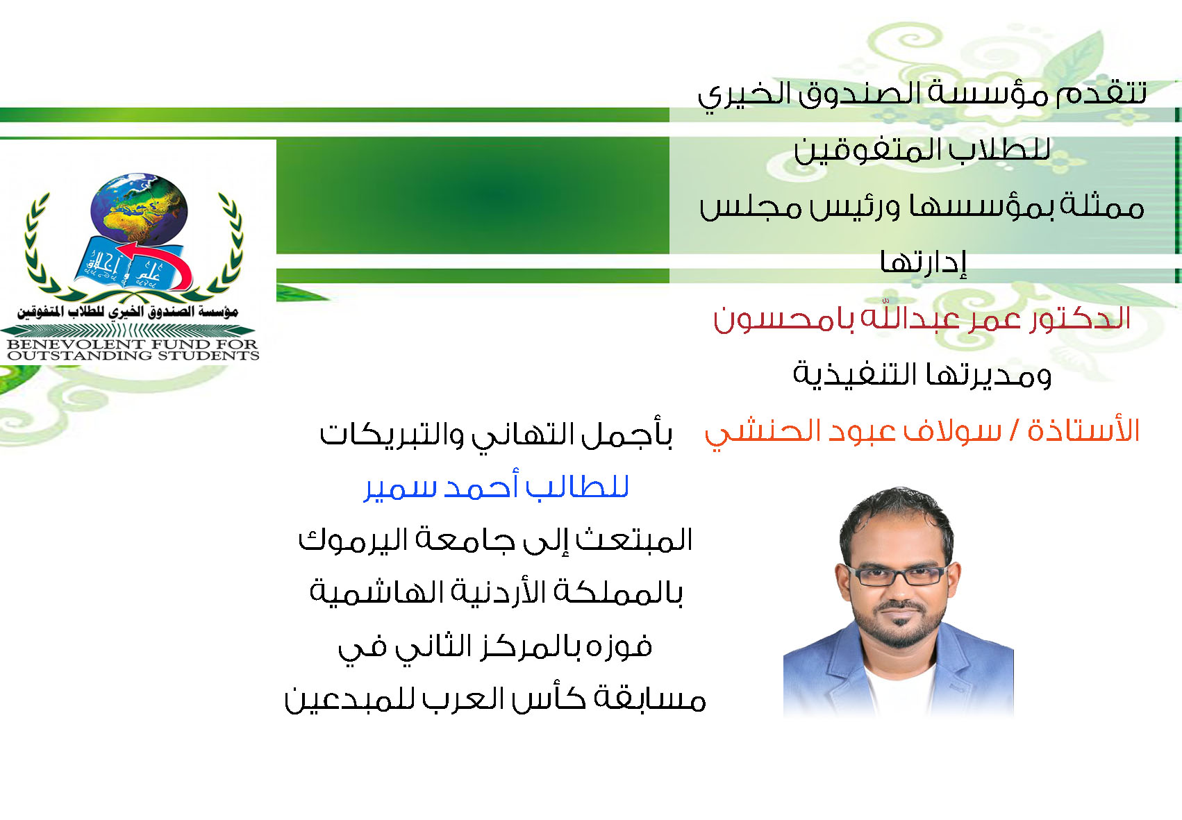 المكلا / اعلام الصندوق الخيري 20ديسمبر2016م نال الطالب أحمد سمير محمد ابراهيم، أحد طلاب مؤسسة الصندوق الخيري للطلاب المتفوقين، المبتعثين إلى جامعة… اقرأ المزيد »طالب من طلاب مؤسسة الصندوق الخيري للطلاب المتفوقين يحصد المركز الثاني في المسابقة الدولية(كأس العالم للمبدعين العرب لعام 2016م)