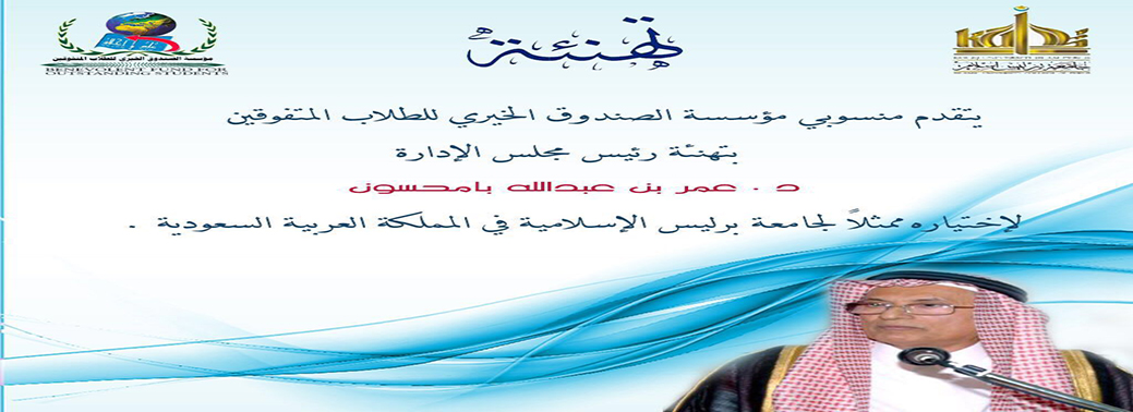 تتقدم مؤسسة الصندوق الخيري للطلاب المتفوقين على رأسها المؤسس الدكتور / عمر عبدالله بامحسون رئيس مجلس الإدارة وأعضاء مجلس الإدارة والمجلس الاستشاري واللجنة العلمية بالمؤسسة… اقرأ المزيد »صبراً آل باعيسى