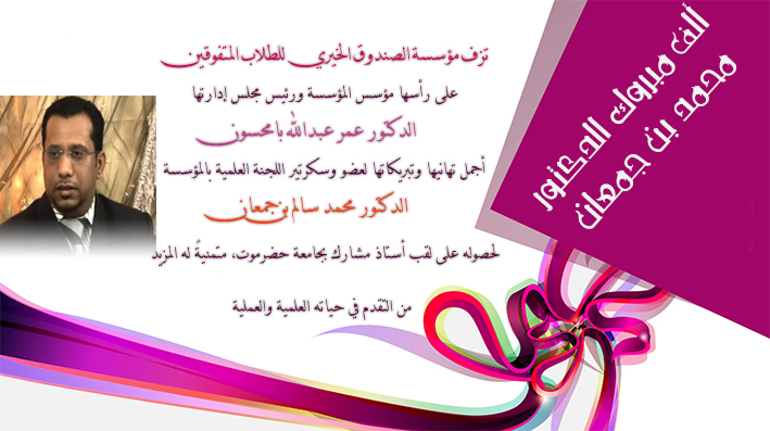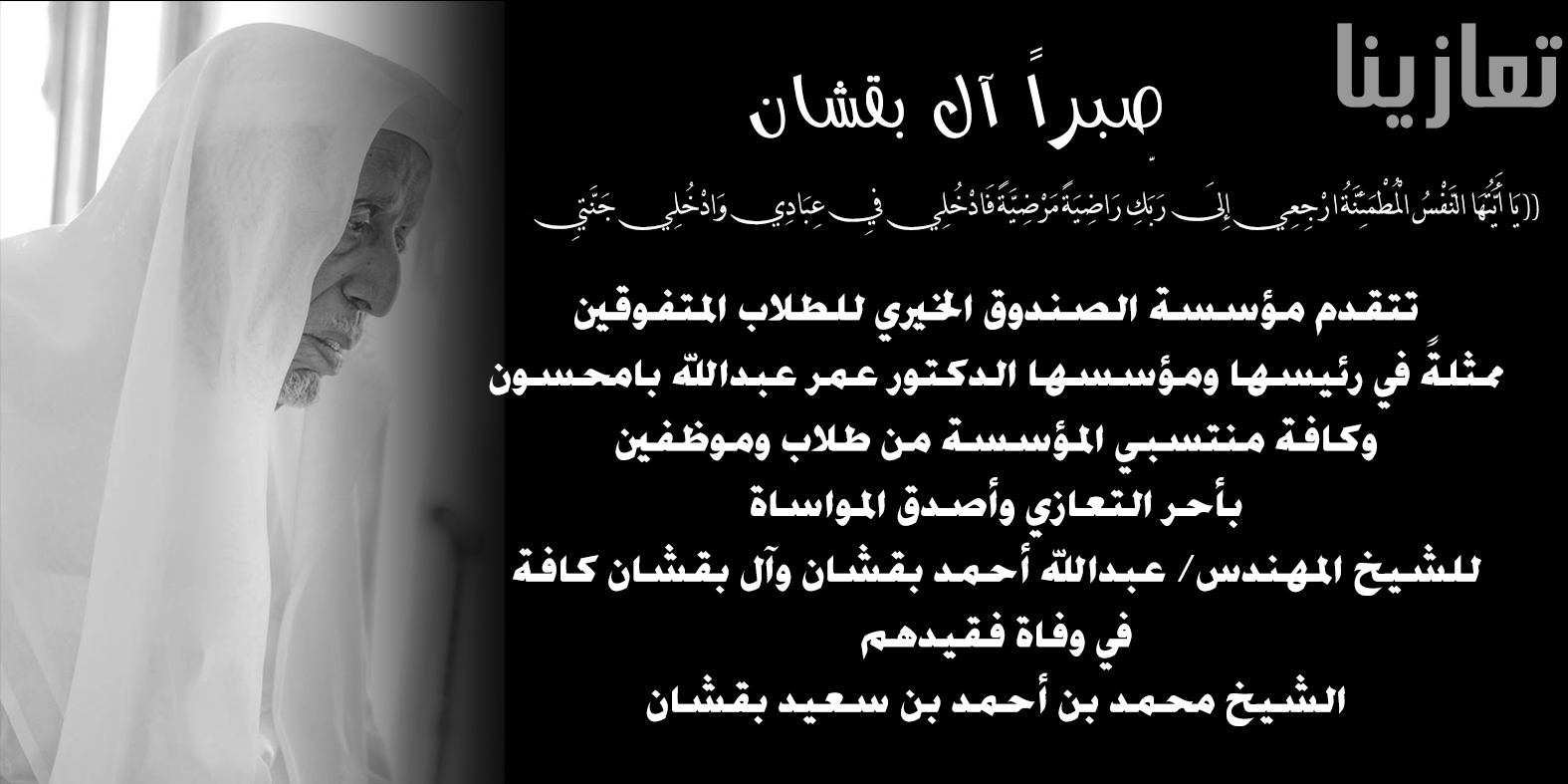 تتقدم مؤسسة الصندوق الخيري للطلاب المتفوقين على رأسها المؤسس الدكتور / عمر عبدالله بامحسون رئيس مجلس الإدارة والمديرة التنفيذية للمؤسسة الأستاذة / سولاف عبود الحنشي… اقرأ المزيد »تعازينا لآل بارمادة وآل بن زيلع
