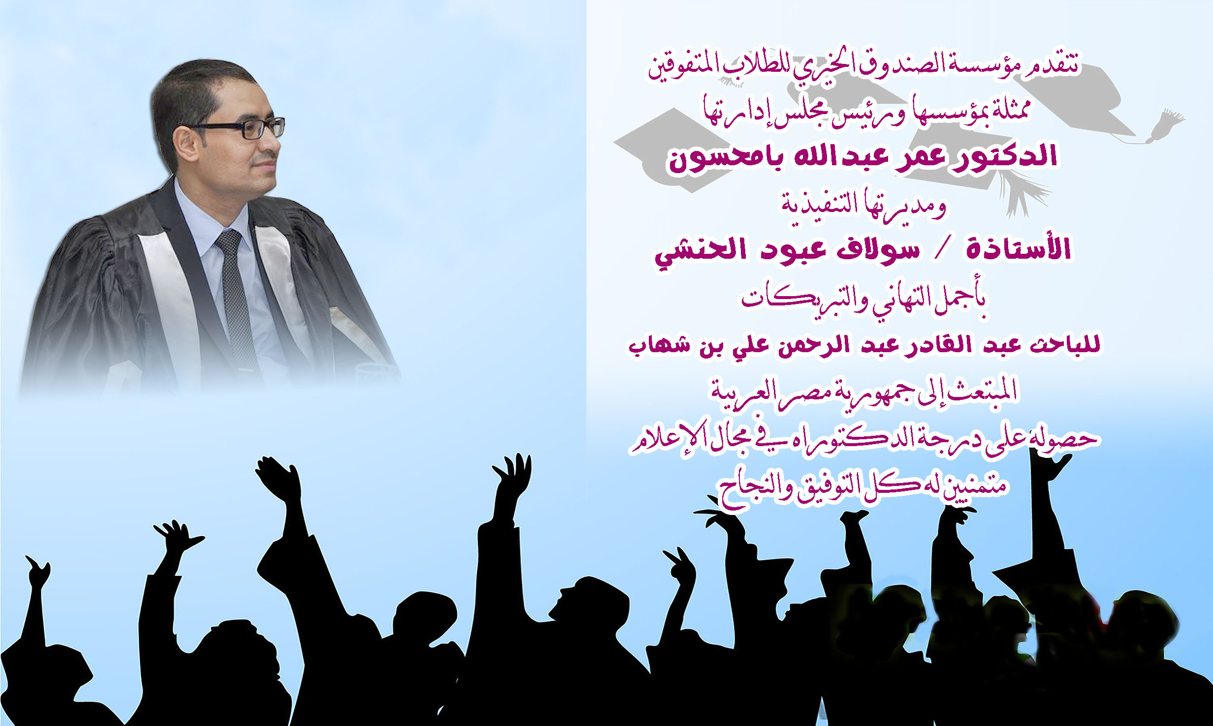 المكلا / إعلام الصندوق الخيري 27 ديسمبر 2016م نال الباحث عبد القادر عبد الرحمن علي محمد بن شهاب، المبتعث من قبل مؤسسة الصندوق الخيري… اقرأ المزيد »الدكتوراه مع مرتبة الشرف الأولى في الإعلام (تخصص العلاقات العامة) لأحد طلاب مؤسسة الصندوق الخيري للطلاب المتفوقين من جامعة أسيوط