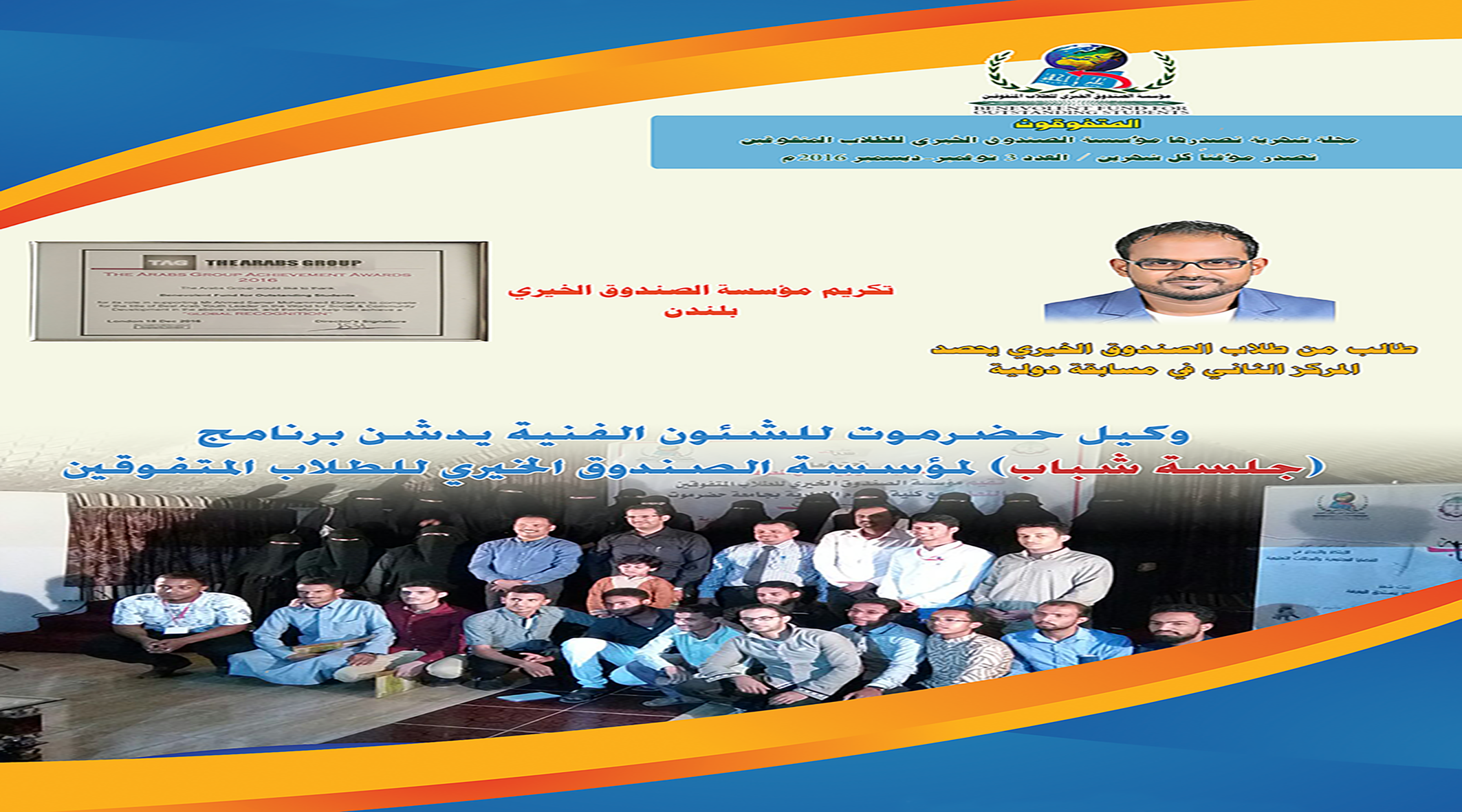 المكلا / إعلام الصندوق الخيري 3 يناير 2017م صدر عن مؤسسة الصندوق الخيري للطلاب المتفوقين العدد الـ(3) من المجلة الإلكترونية(المتفوقون)التي تصدرها المؤسسة كل شهرين… اقرأ المزيد »تصدرها مؤسسة الصندوق الخيري للطلاب المتفوقين…صدور العدد الـ(3) من المجلة الالكترونية (المتفوقون)