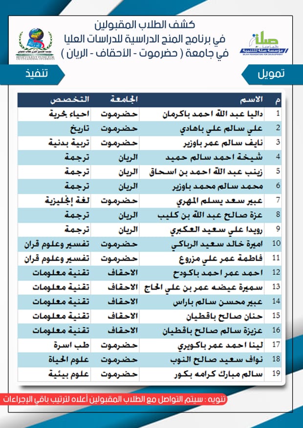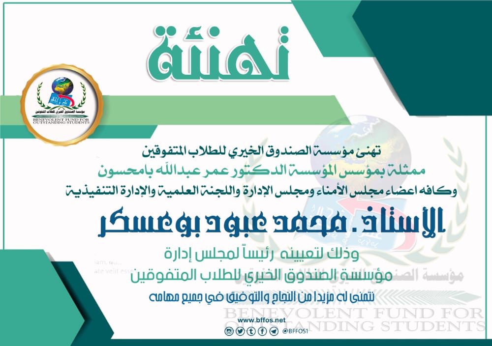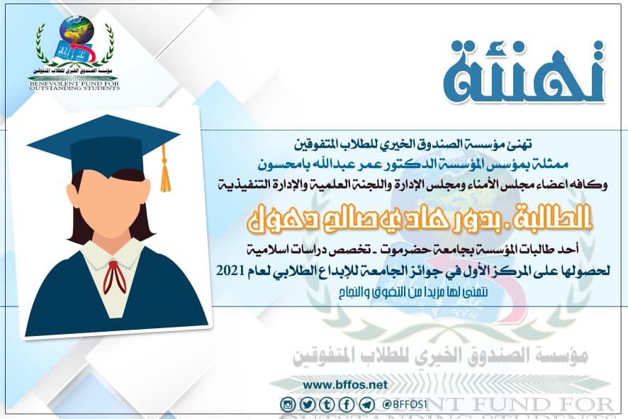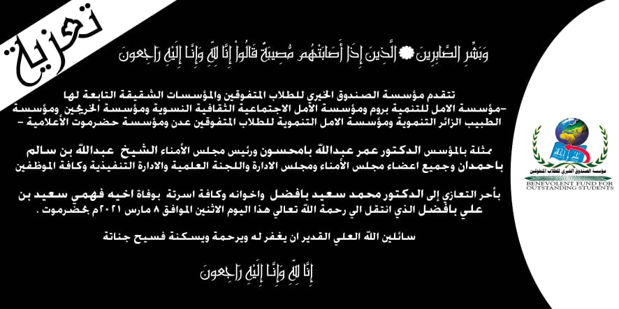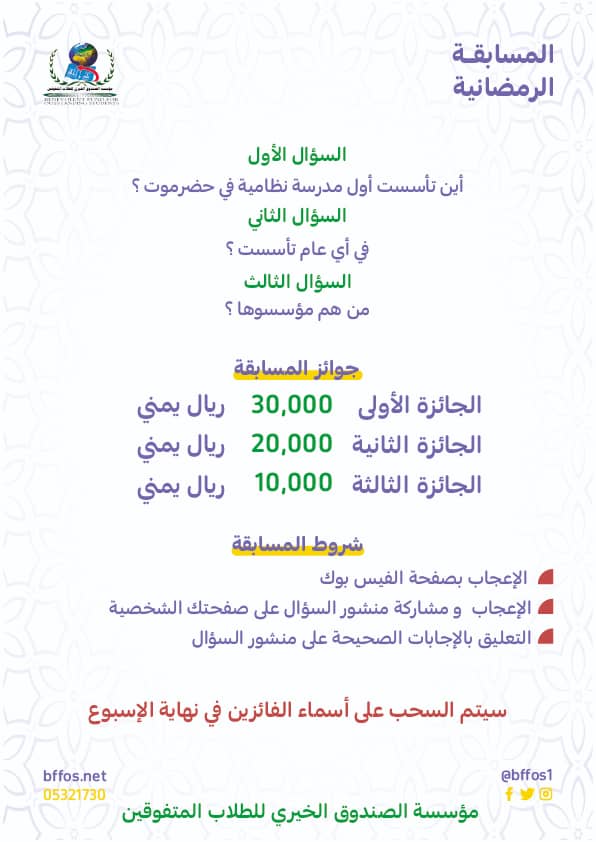 المكلا | اعلام المؤسسة الخميس 17 مارس 2022 ================= دشنت بقاعة الأديب علي أحمد باكثير بديوان رئاسة جامعة حضرموت فعاليات أسبوع البحث العلمي الثاني الذي… اقرأ المزيد »مؤسسة الصندوق الخيري للطلاب المتفوقين تشارك جامعة حضرموت تدشين فعاليات أسبوع البحث العلمي الثاني بالمكلا