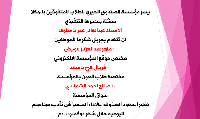 مؤسسة الصندوق الخيري للطلاب المتفوقين بالمكلا تعلن اسماء المقبولين لمنح 2018-2019م