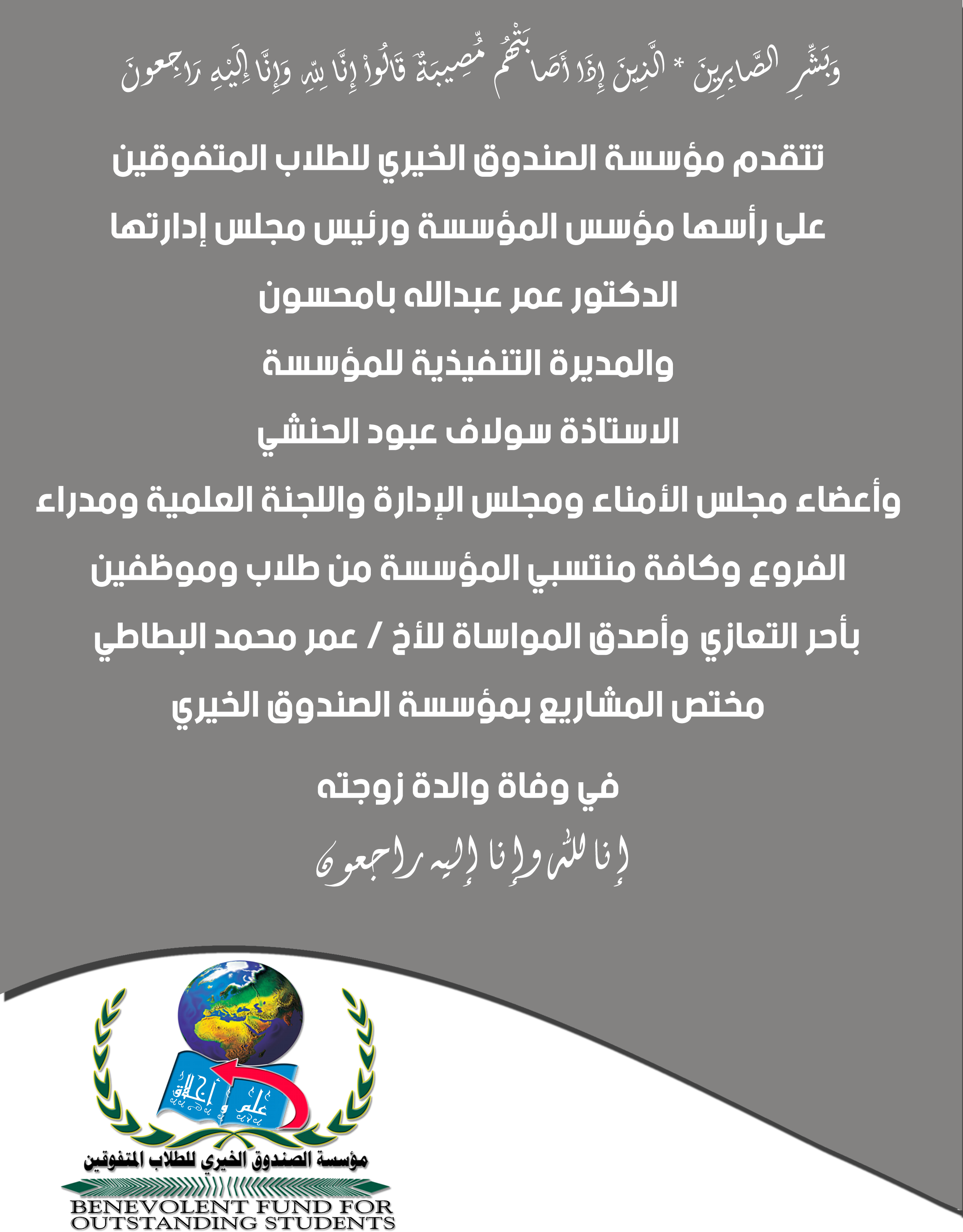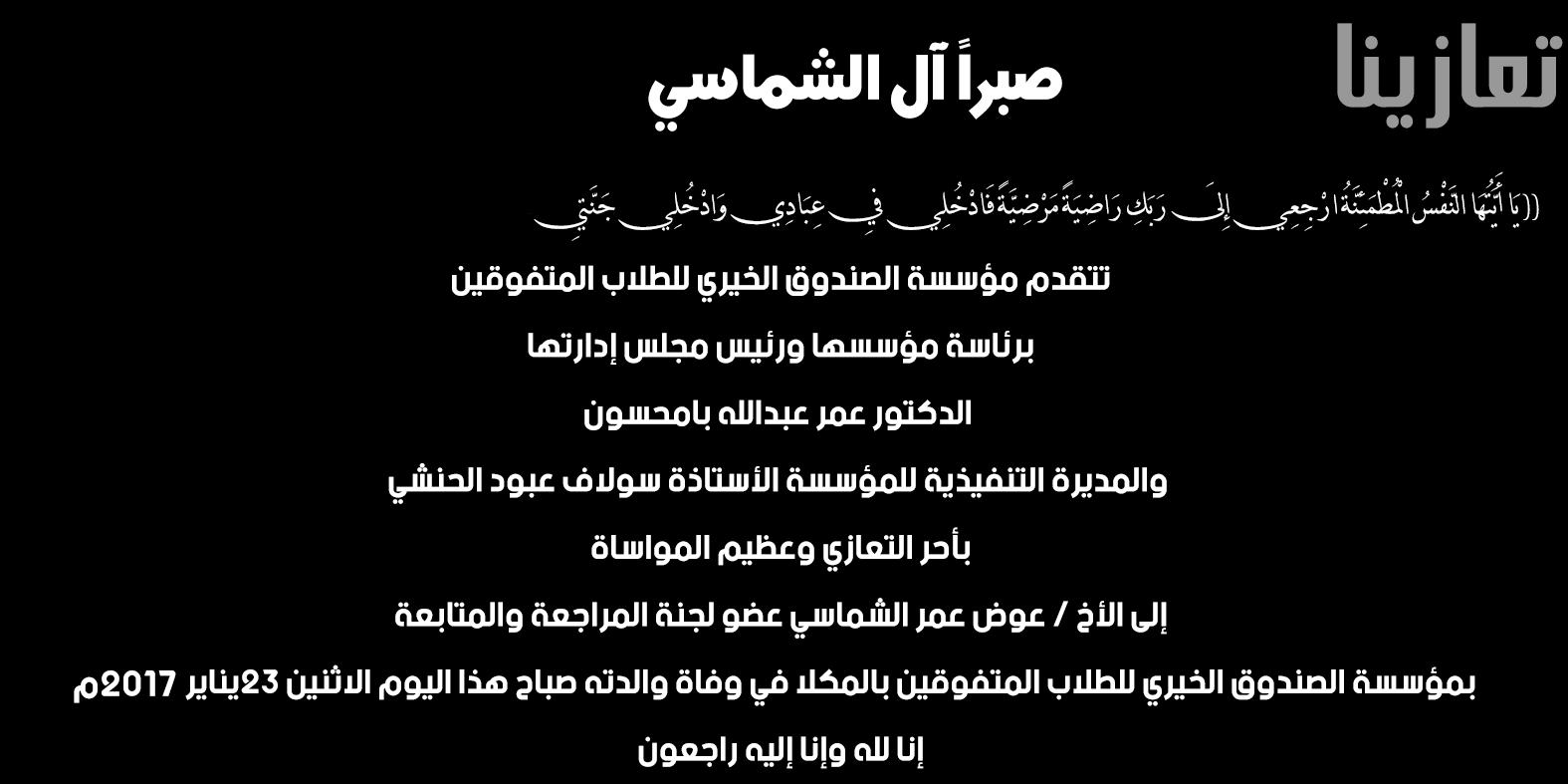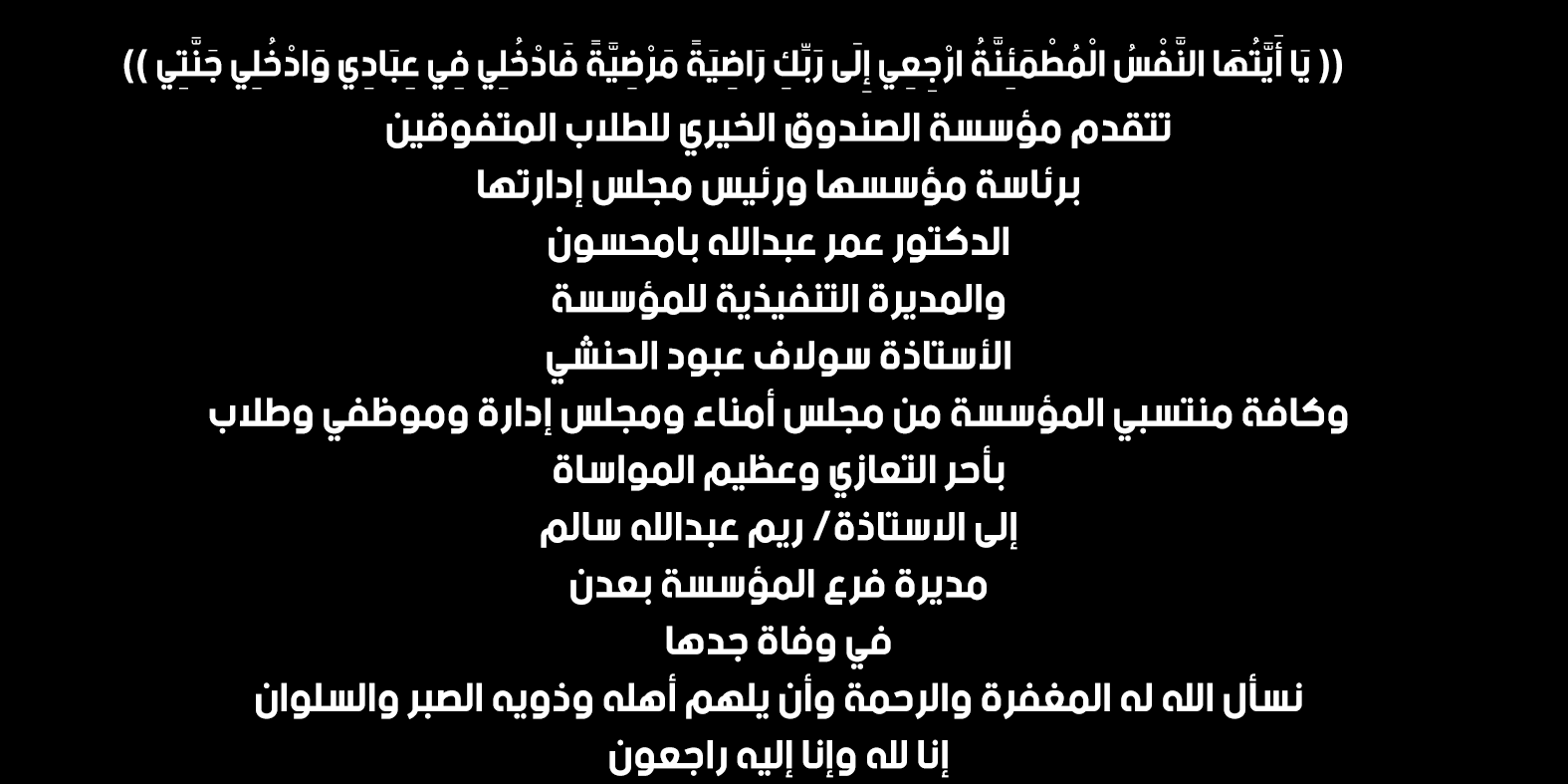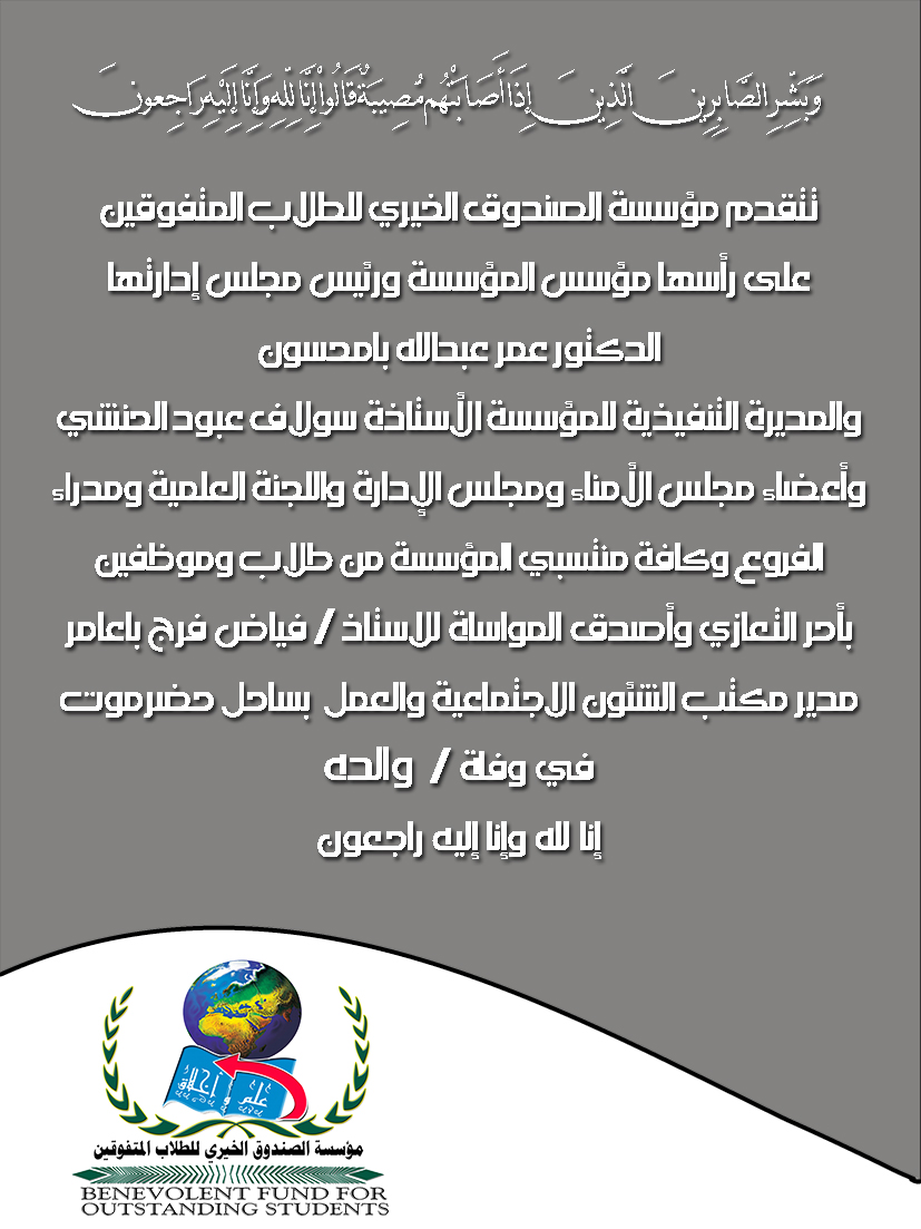 المكلا/ اعلام الصندوق الخيري للطلاب المتفوقين 24يناير2017م يأبى العام الجديد 2017م أن يزف لنا الخير، كأخيه الذي قبله العام 2016م. ورغم حداثة عهده في… اقرأ المزيد »علمتنا أنه لا شيء يمنع الإنسان من تحقيق أحلامه…فإلى جنة الخلد ياعائشة