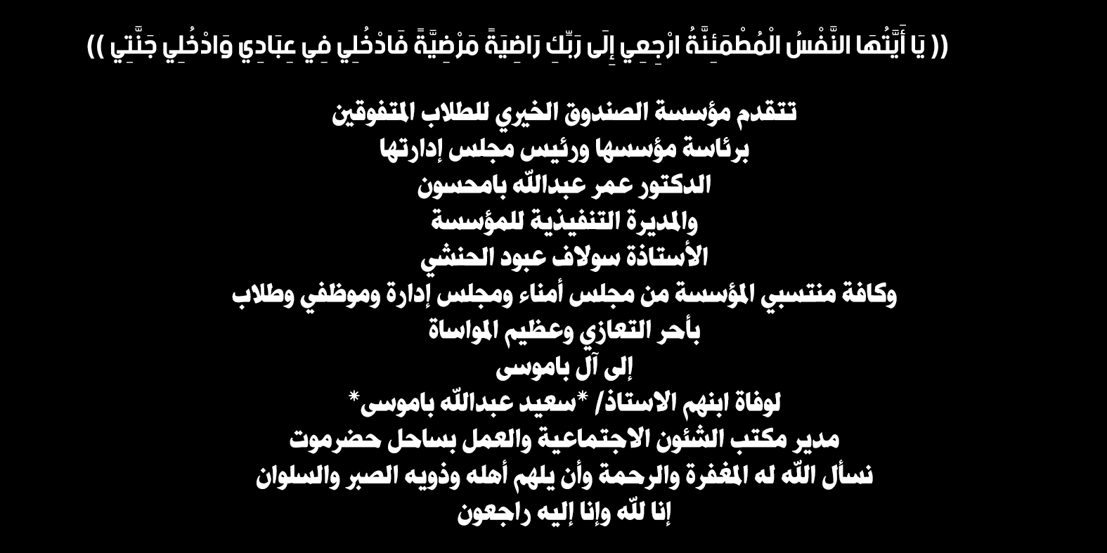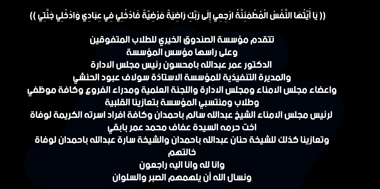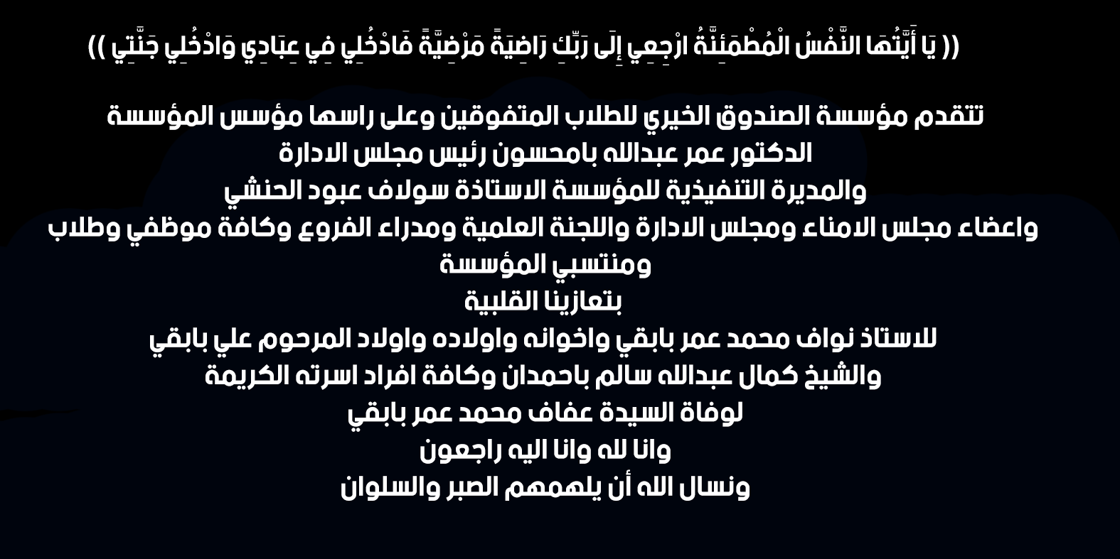 المكلا/ اعلام الصندوق الخيري للطلاب المتفوقين 24يناير2017م يأبى العام الجديد 2017م أن يزف لنا الخير، كأخيه الذي قبله العام 2016م. ورغم حداثة عهده في… اقرأ المزيد »علمتنا أنه لا شيء يمنع الإنسان من تحقيق أحلامه…فإلى جنة الخلد ياعائشة