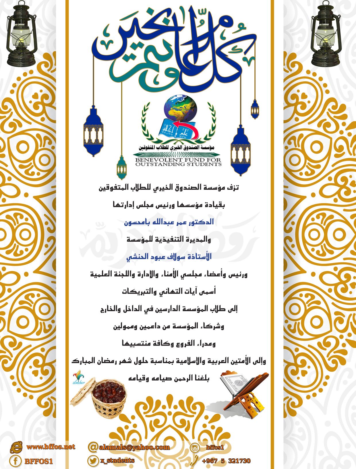 اعلام / مؤسسة الصندوق الخيري 2017/4/30م تم صباح اليوم 30ابريل 2017م بقاعة الفقيد علي هود باعباد تكريم الدكتور عمر عبدالله بامحسون رئيس مجلس ادارة الصندوق… اقرأ المزيد »تكريم مؤسسة الصندوق الخيري للطلاب المتفوقين في شخص الدكتور عمر عبدالله بامحسون من جامعة حضرموت